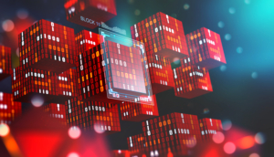 Blockchain technology. Information blocks in digital space. Decentralized global network. Cyberspace data protection. 3D illustration with elements of a binary code